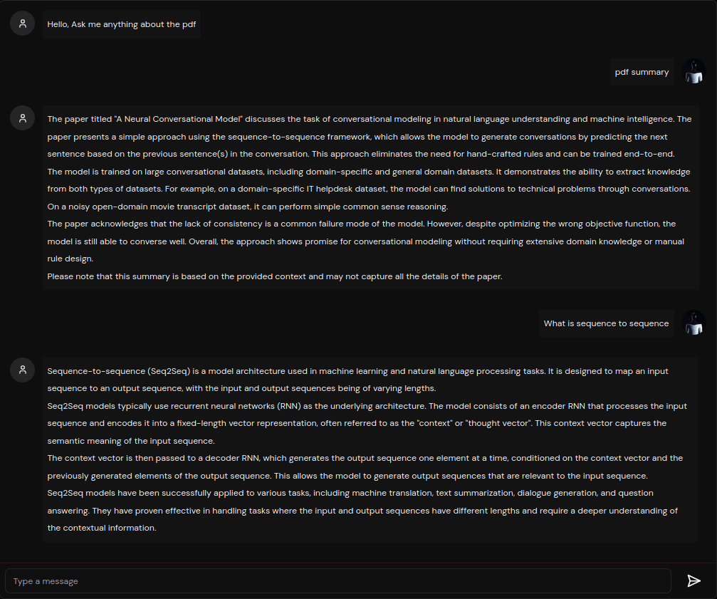 - Retrieval augmented generation with help of PineconeDB vector database to provide the OpenAI model a grouned knowledge base.